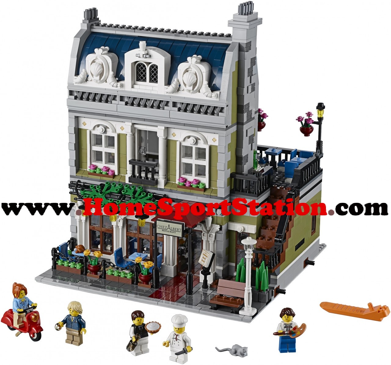 Loading... Please wait...It’s very busy in the Parisian Restaurant! As a scooter zips by, inside the waiter rushes between the tables as the nervous young man gets ready to propose with the ring! It’s just as hectic behind the scenes, with the chef busily preparing the food. This beautifully detailed building is the setting for so many stories and is a great addition to the modular building series. The Parisian Restaurant has a fully-stocked, blue and white tiled kitchen with tableware as well as a cozy apartment with pull-down bed, kitchenette and fireplace. On the top floor is the artist’s room with a studio that includes a cast iron heater, easel, paintbrush and two works of art by the aspiring artist. Outside, stairs lead down to the roof terrace lined with hanging lantes and flowers where the diners eat alfresco-style. This amazing Parisian Restaurant model even includes a facade with croissants, clams and feather details that recapture the feel of Paris. Includes 5 minifigures: chef, waiter, girl and a romantic couple.